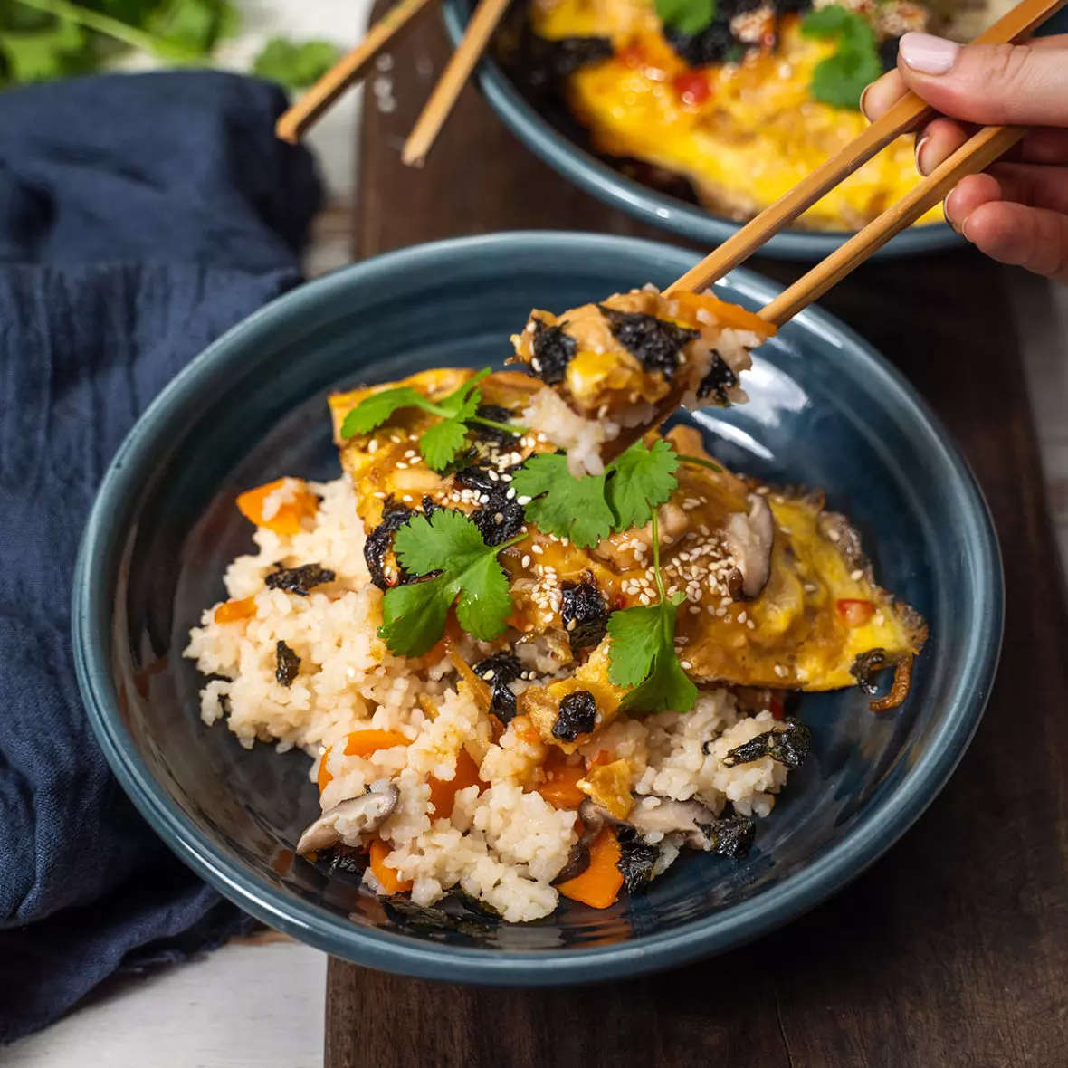- Fluff the rice mixing shiitake and carrot pieces well. Fill four serving bowls with rice. Top with omelette. Serve immediately, garnished with sesame seeds, coriander, nori and sweet chilli sauce.